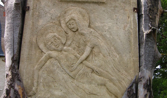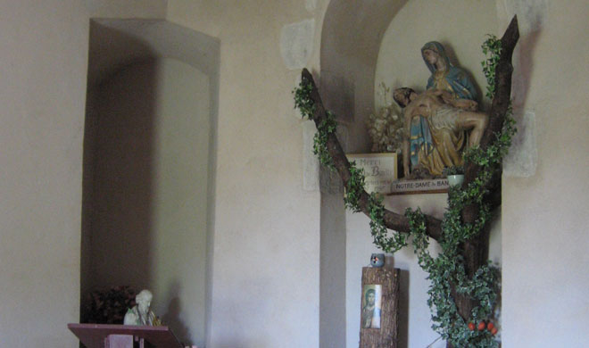 La chapelle, ou l'oratoire, Notre-Dame qui est au coeur du pélerinage. Elle se situe au chevet de l'église. La statue de Notre-Dame de Pitité rappelle l'ormeau et la pierre avec l'image de Marie. Un oratoire où l'on peut venir discrétement se recueillir et inscrire une intention sur le cahier déposé à cet effet.